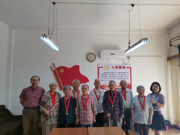 王际睿与老党员们齐聚一堂促膝而谈,亲切慰问他们的身体和生活状况,转达学院党委对老党员们的关心问候,并为他们亲自佩戴“光荣在党50年”纪念章和发放慰问金,感谢他们矢志不渝为党的教育事业所做出的贡献。随后,王际睿向老党员同志们汇报了学校学院近期取得主要成绩以及未来5年的发展规划,并希望他们继续为学校发展多提宝贵意见。