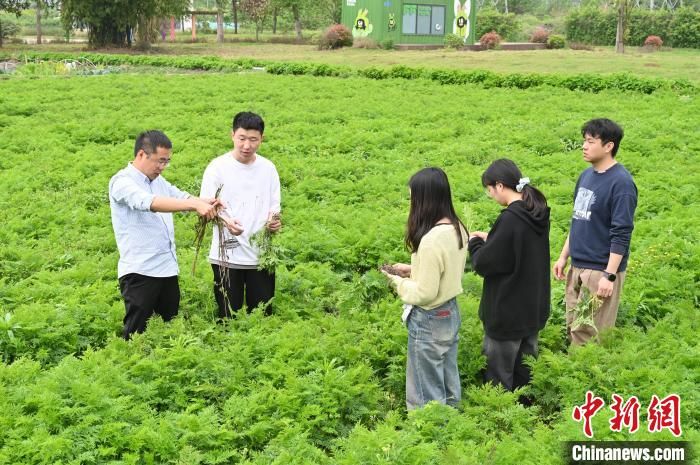 侯凯(左一)与学生在试验田观察川芎种植。 安源 摄