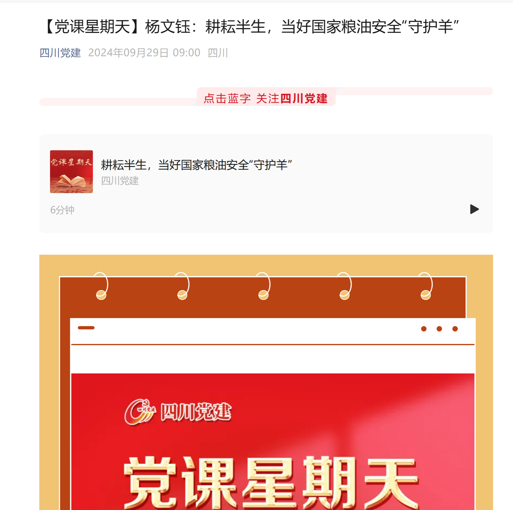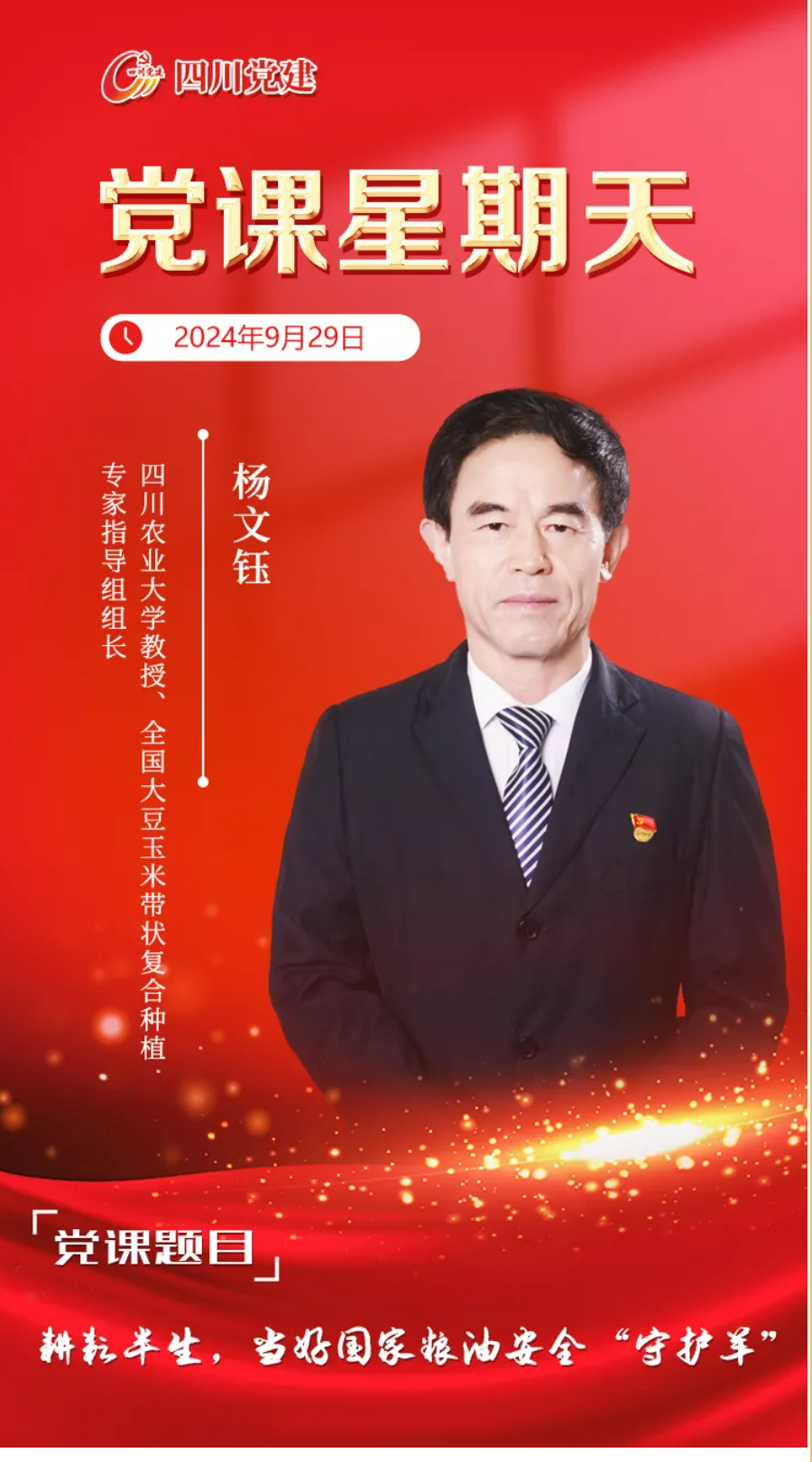大家好,我是四川农业大学教授杨文钰。今天,我分享的党课题目是《耕耘半生,当好国家粮油安全“守护羊”》,与大家交流坚持守正创新、践行初心使命的感悟。