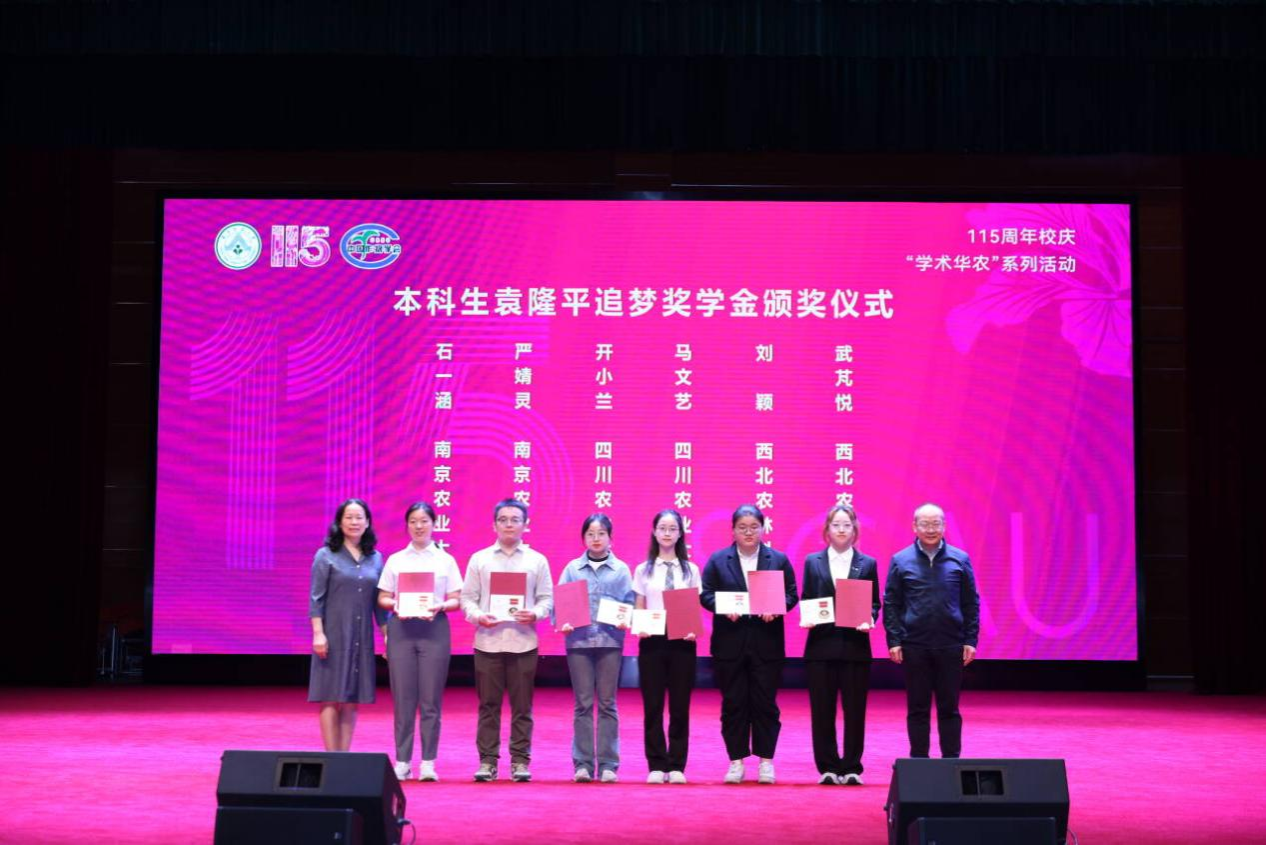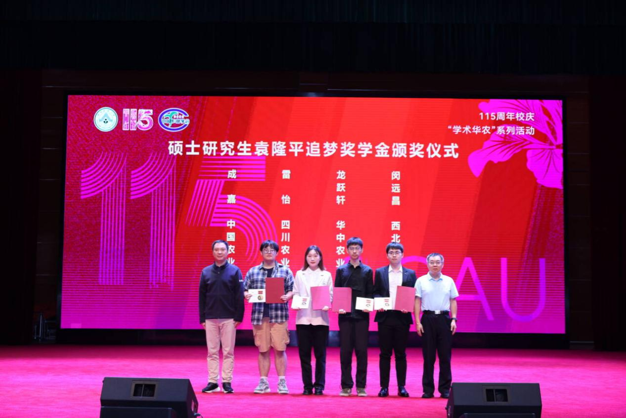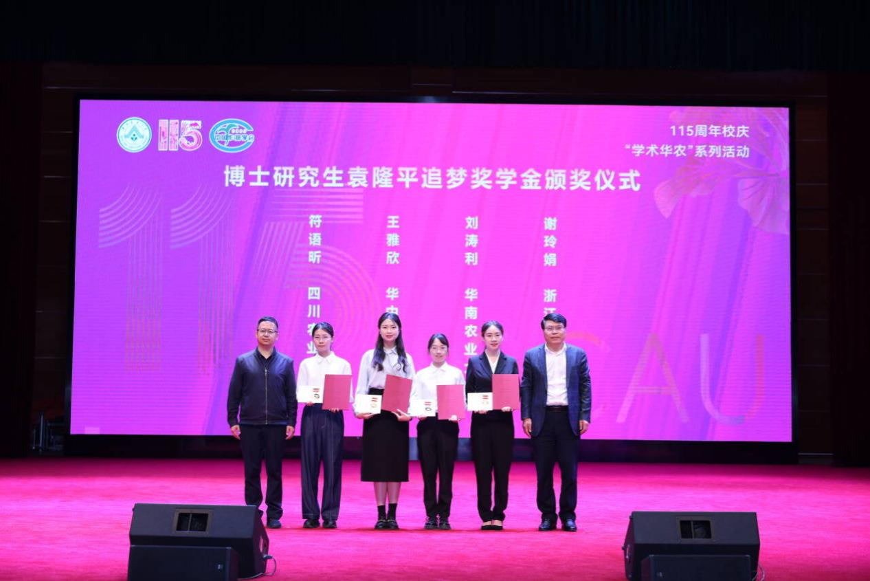 近日,2023-2024学年“袁隆平追梦奖学金”颁奖仪式在华南农业大学隆重举行。我校小麦研究所2020级博士研究生符语昕(导师王际睿教授)、开云在线注册(中国)登录入口硕士研究生雷怡(导师杨文钰教授、杨峰教授)、开云在线注册(中国)登录入口种子科学与工程专业2022级本科生马文艺及农学专业2022级本科生开小兰4名作物学科学子荣获本年度“袁隆平追梦奖学金”,并受邀到现场参加颁奖仪式,累计获得奖励7万元。