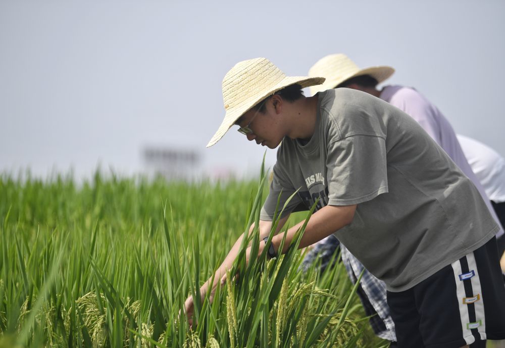 今夏,在永丰村驻守的马均教授团队在田间观察水稻生长情况。