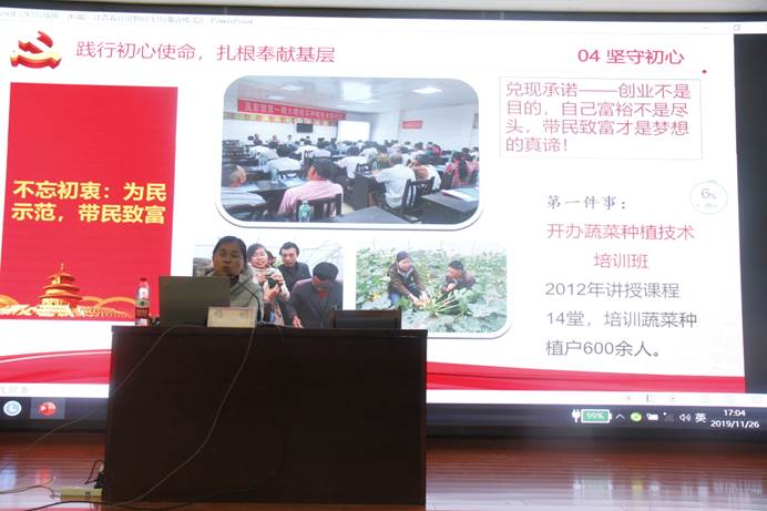 报告会开始,杨媚播放了《红岩本色》节目“谁的青春不迷茫”,讲述了她在吴家镇双流村的创业经历与青春故事。随后,杨媚从“我的初心”“初心养成”“践行初心”“坚守初心”“初心不变”五个方面讲述了她对梦想的热爱与坚守。