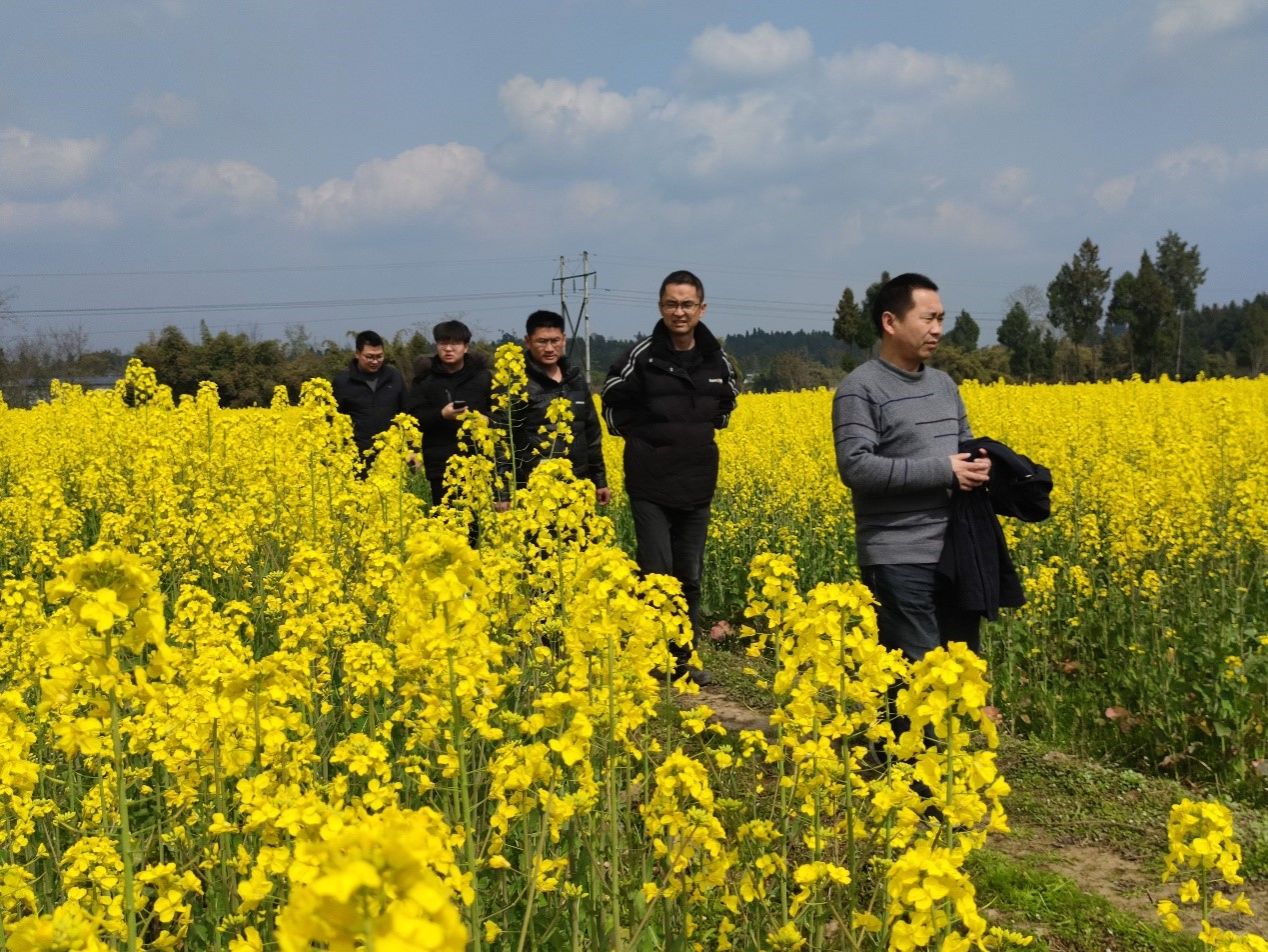 依托我校研发的油菜联合播种机及高湿粘重土壤环境的油菜机直播丰产高效技术,阳春三月的油稻全程机械化示范基地的油菜花全面盛开,美不胜收。针对油稻轮作茬口衔接、油菜田间管理和低损收获等问题,雷小龙查看前期低温天气对油菜结荚的影响,提出了做好菌核病防治和喷施硼肥的建议,并建议通过化控促同步成熟和适宜收获机械降低机收损失。
